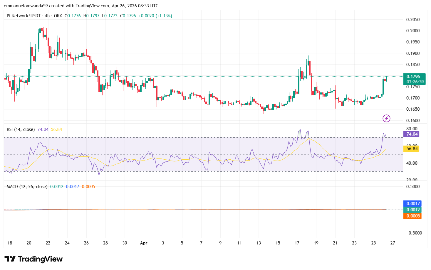 On April 26, 2026, Pi price analysis indicates a bullish trend, with PI trading at $0.1774. The token shows a 3.38% increase in value over the last 24 hours. Buyers pushed the price above the $0.17 region they are in control as PI moves toward the $0.1810 resistance level, where a breakout could strengthen short-term momentum.